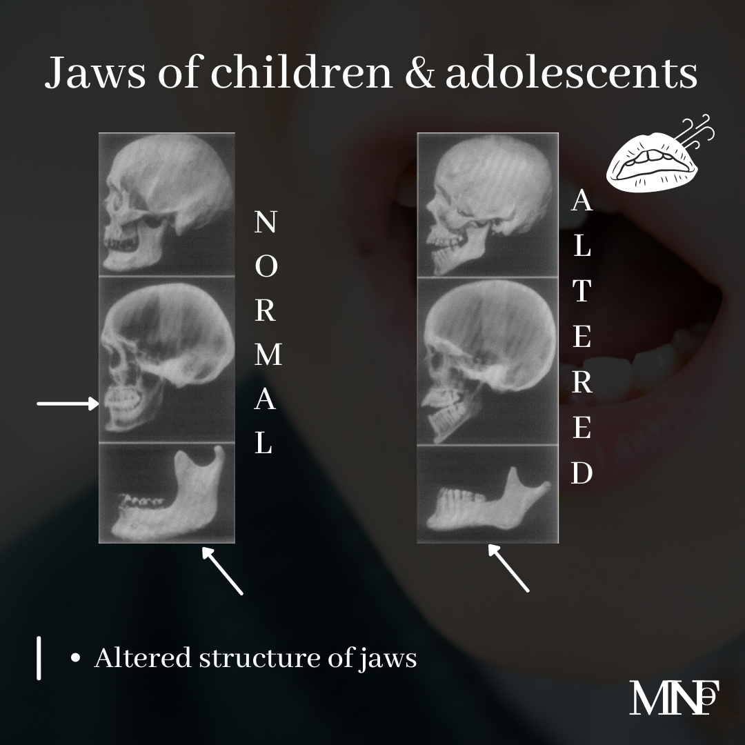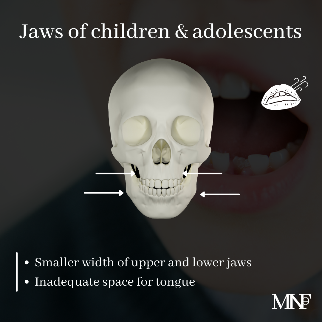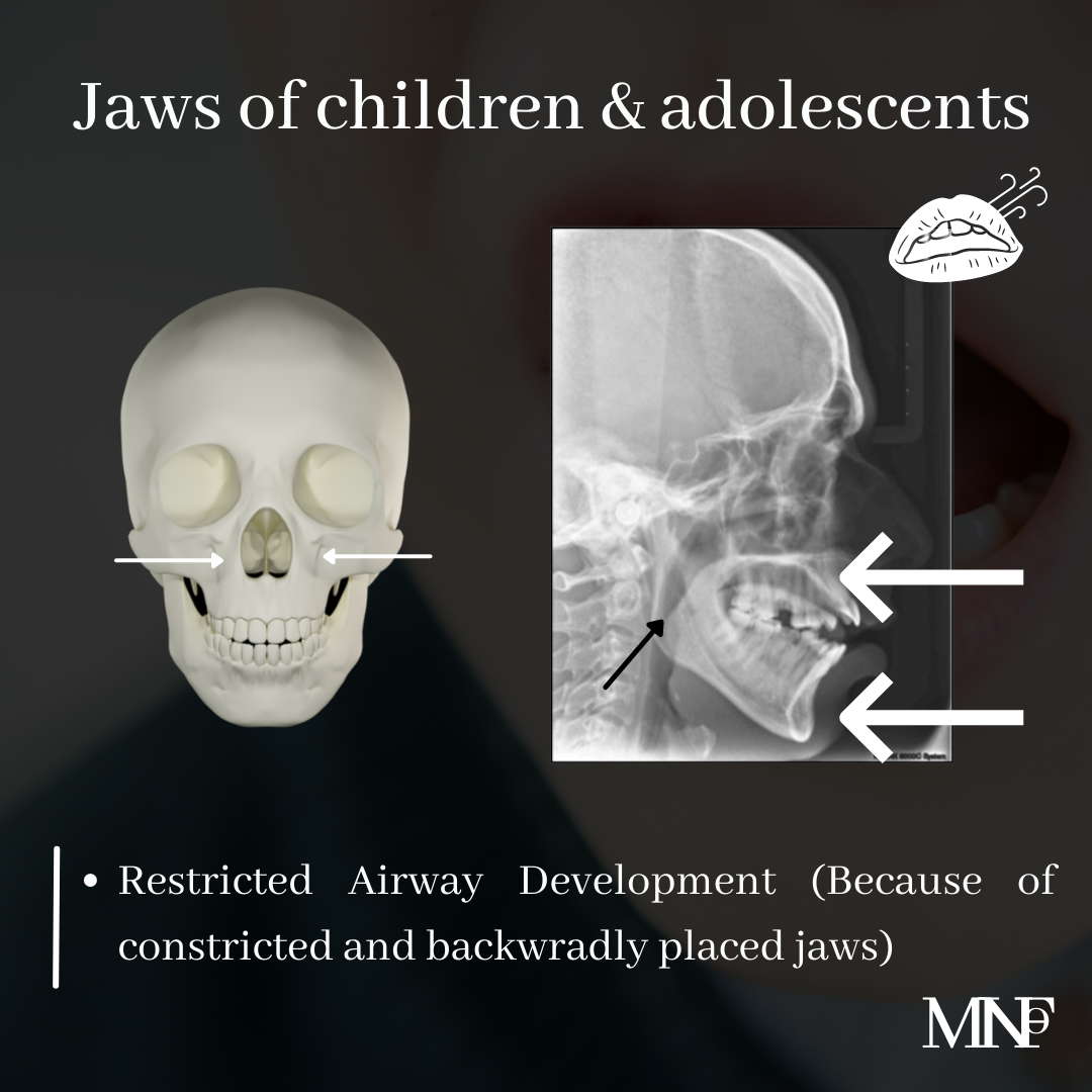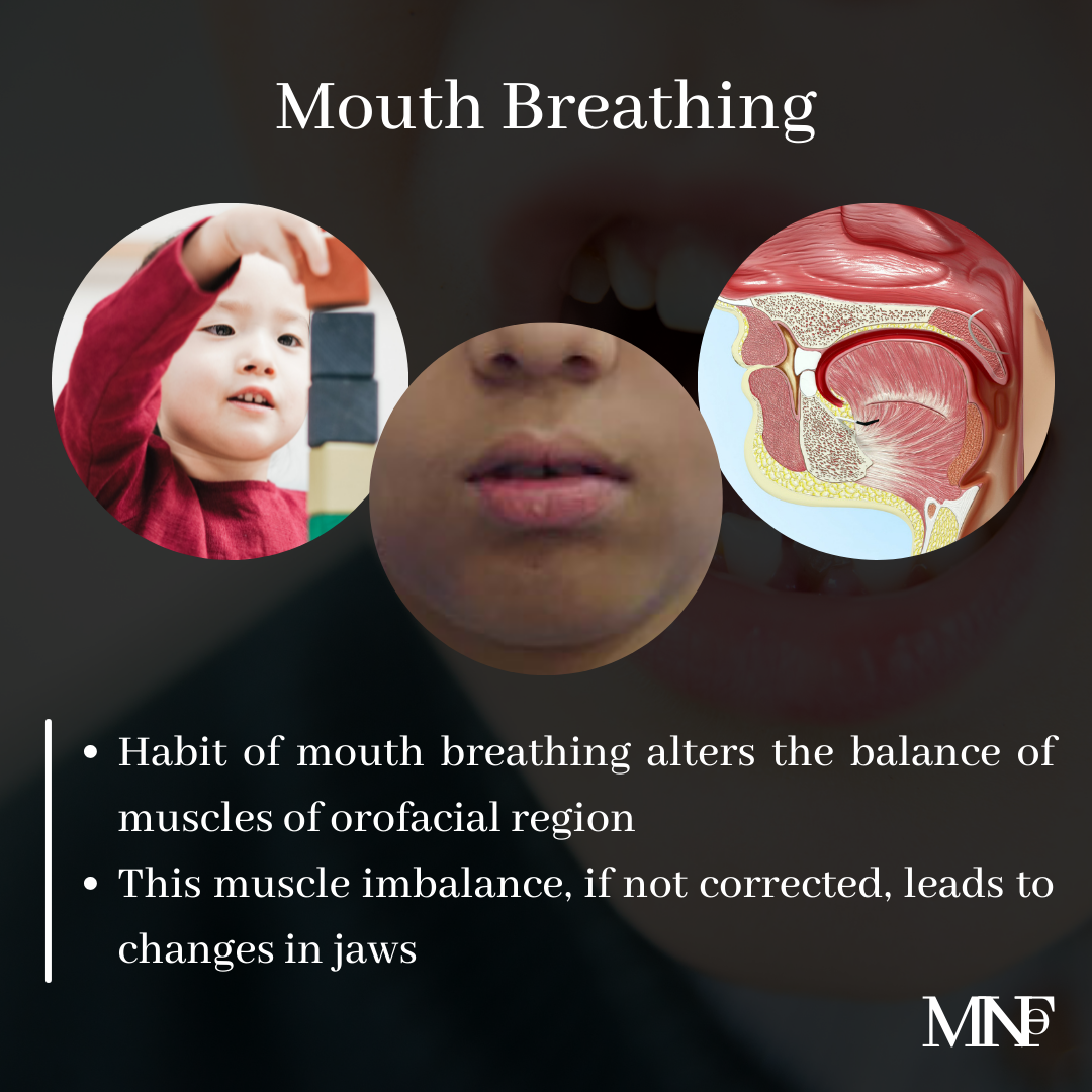 [ultimate_spacer height=”20″][ultimate_heading main_heading=”Effects of mouth breathing on jaws of children & adolescents” heading_tag=”h3″ alignment=”left” margin_design_tab_text=””][/ultimate_heading][ultimate_spacer height=”15″][vc_column_text]Habit of mouth breathing alters the balance of muscles of orofacial region. This muscle imbalance, if not corrected, leads to changes in jaws.- Smaller width of upper and lower jaws