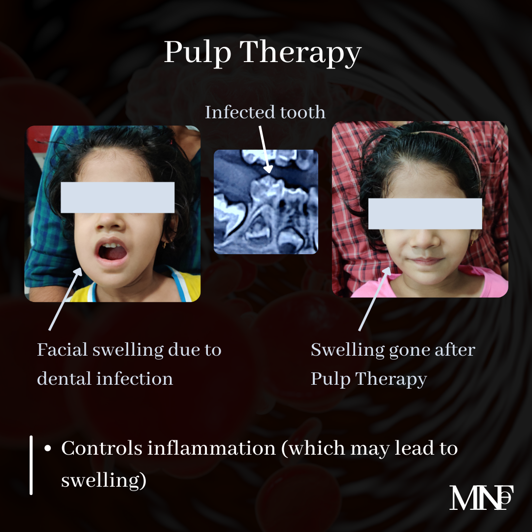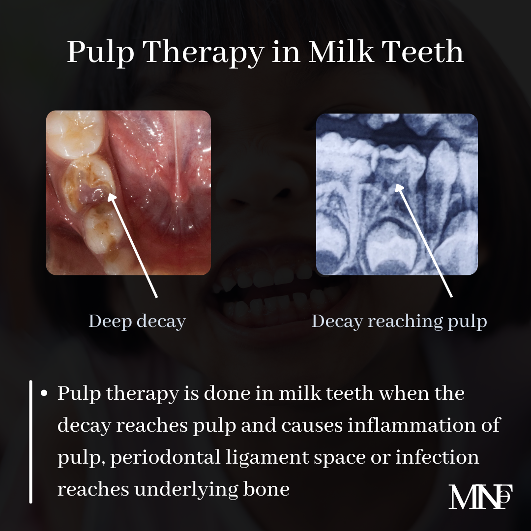 [ultimate_spacer height=”20″][ultimate_heading main_heading=”Importance of Pulp Therapy in Milk Teeth” heading_tag=”h3″ alignment=”left”]Pulp therapy is done in milk teeth when the decay reaches pulp and causes inflammation of pulp, periodontal ligament space or infection reaches underlying bone.