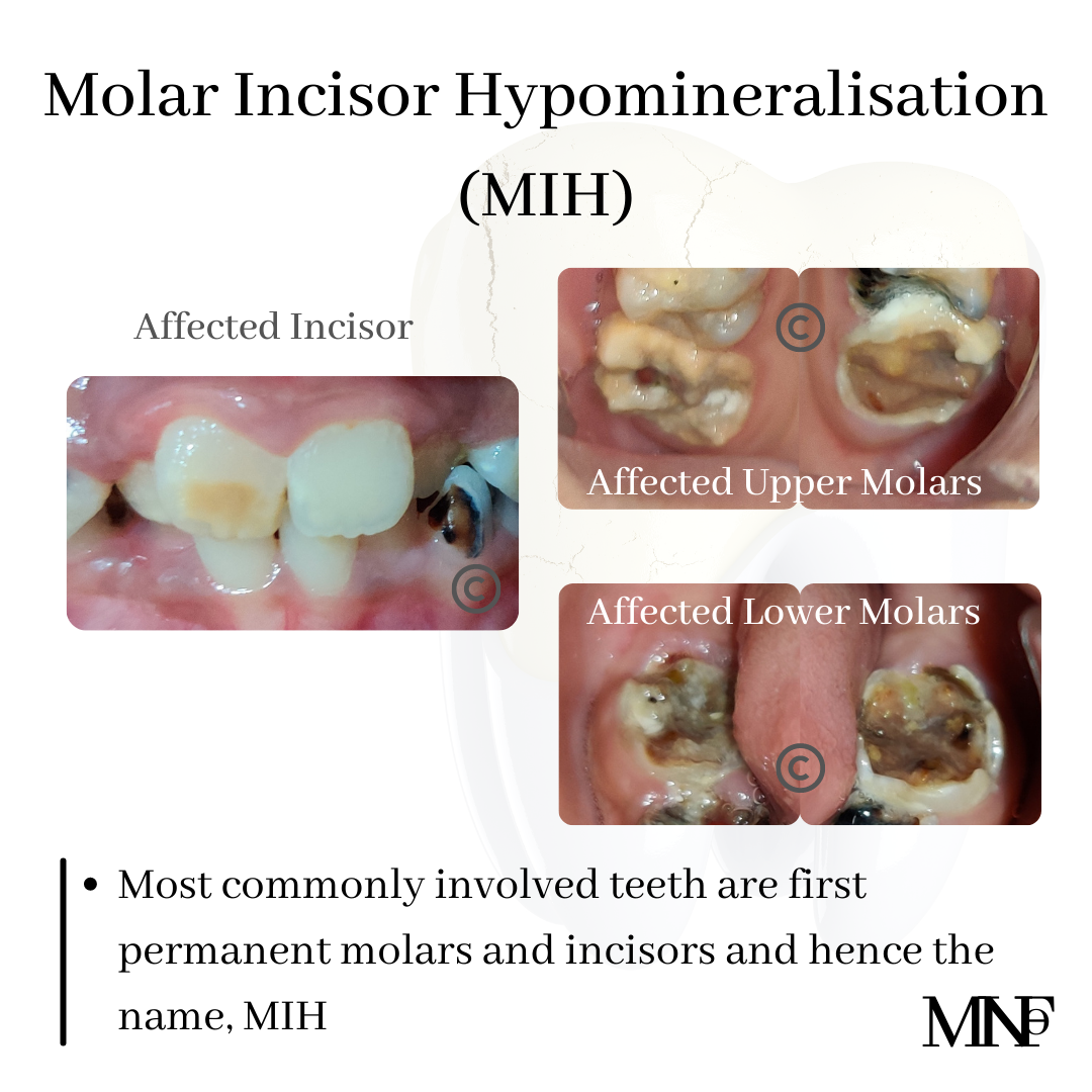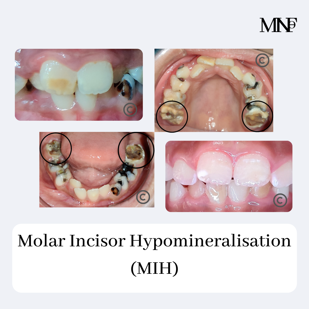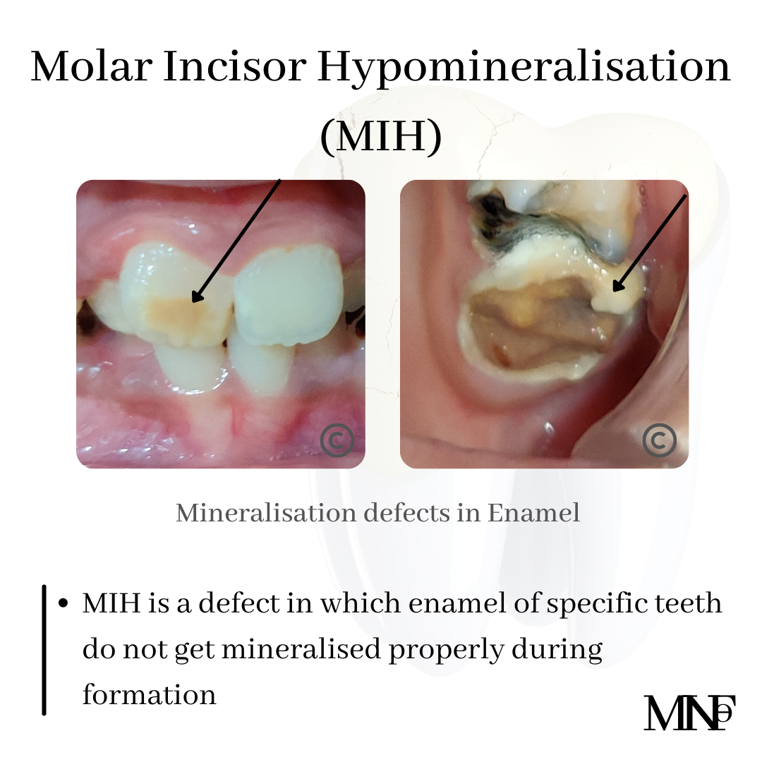 [ultimate_spacer height=”20″][ultimate_heading main_heading=”Molar Incisor Hypomineralisation (MIH)” heading_tag=”h3″ alignment=”left”]MIH is a defect in which enamel of specific teeth do not get mineralised properly during formation. Most commonly involved teeth are first permanent molars and incisors and hence the name, MIH.The defect in enamel mineralisation leads to white spots or discoloration of teeth. The affected teeth are weak and more prone to fractures and decay. In the majority of cases, the affected first permanent molars show rapid decay just after eruption.