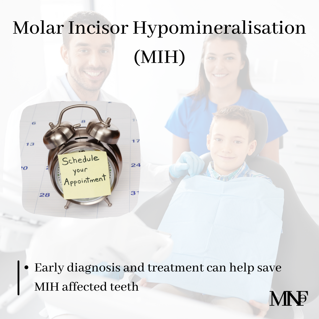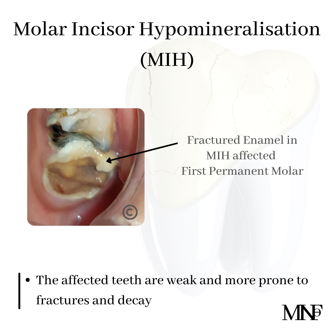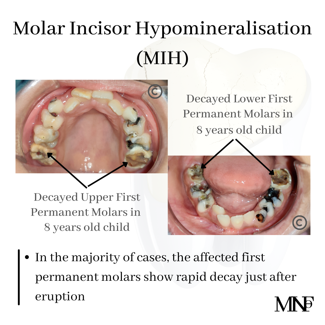 [ultimate_spacer height=”20″][ultimate_heading main_heading=”Molar Incisor Hypomineralisation (MIH)” heading_tag=”h3″ alignment=”left”]MIH is a defect in which enamel of specific teeth do not get mineralised properly during formation. Most commonly involved teeth are first permanent molars and incisors and hence the name, MIH.The defect in enamel mineralisation leads to white spots or discoloration of teeth. The affected teeth are weak and more prone to fractures and decay. In the majority of cases, the affected first permanent molars show rapid decay just after eruption.
