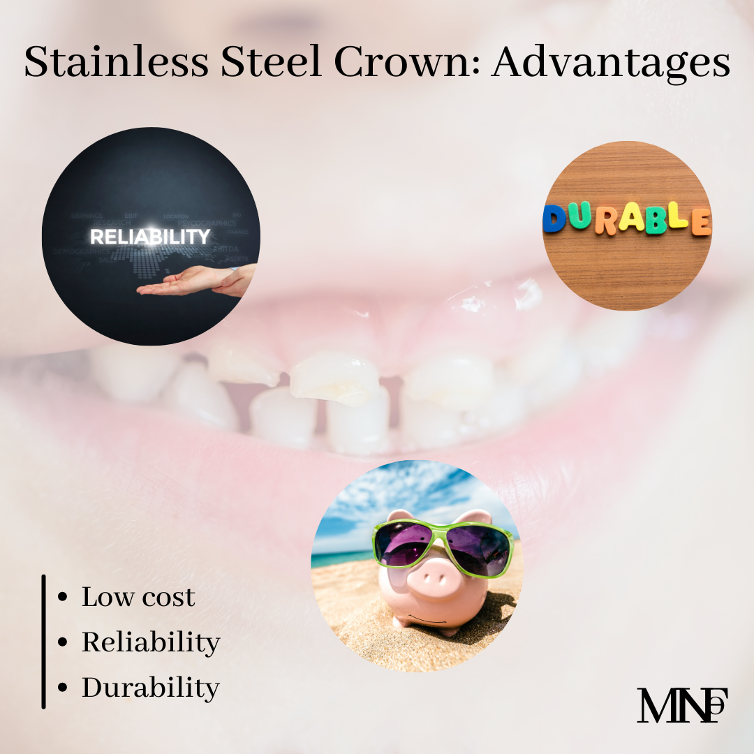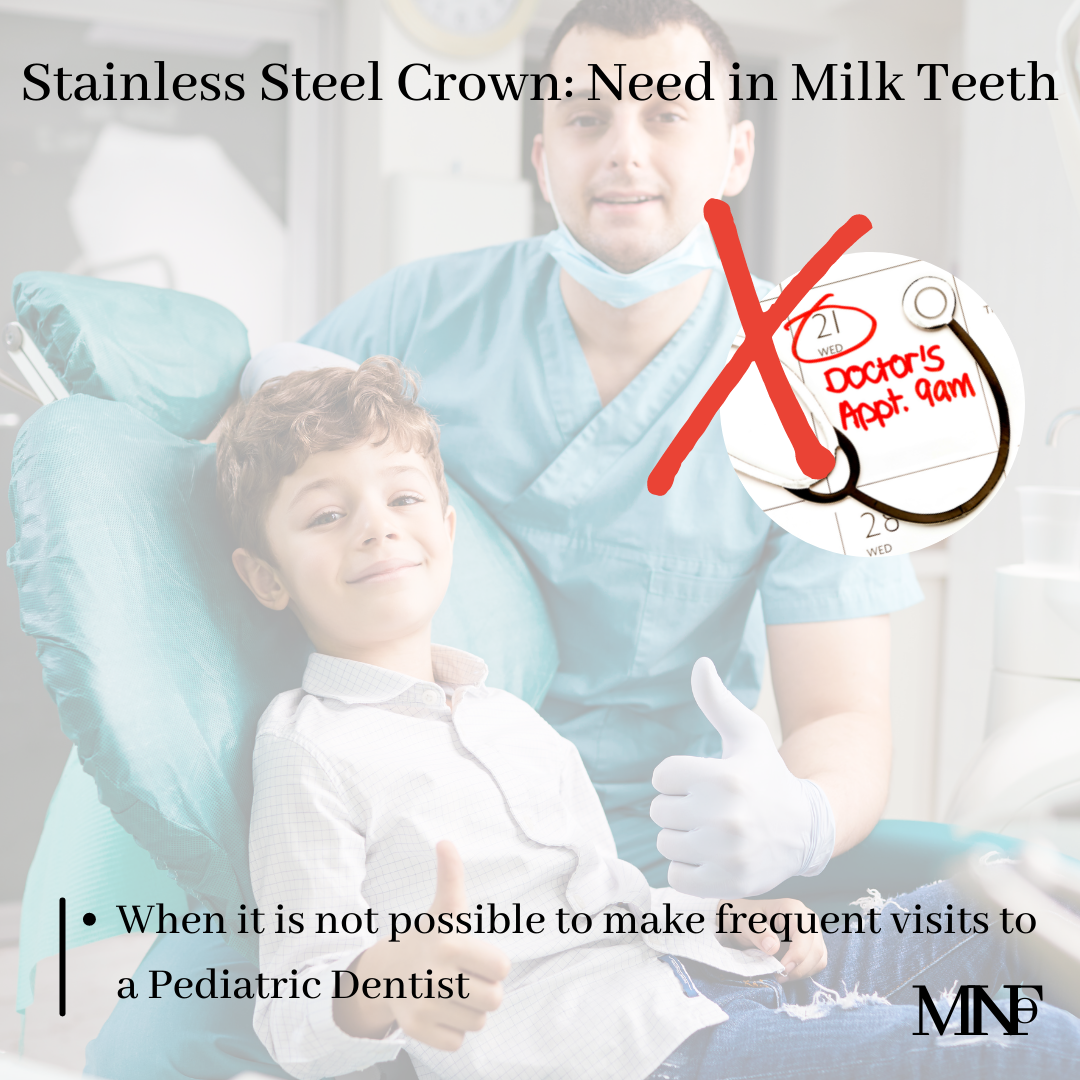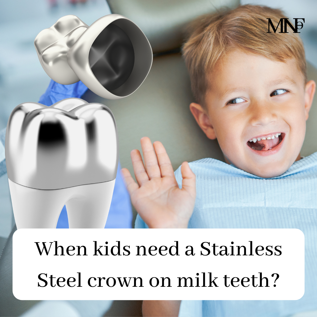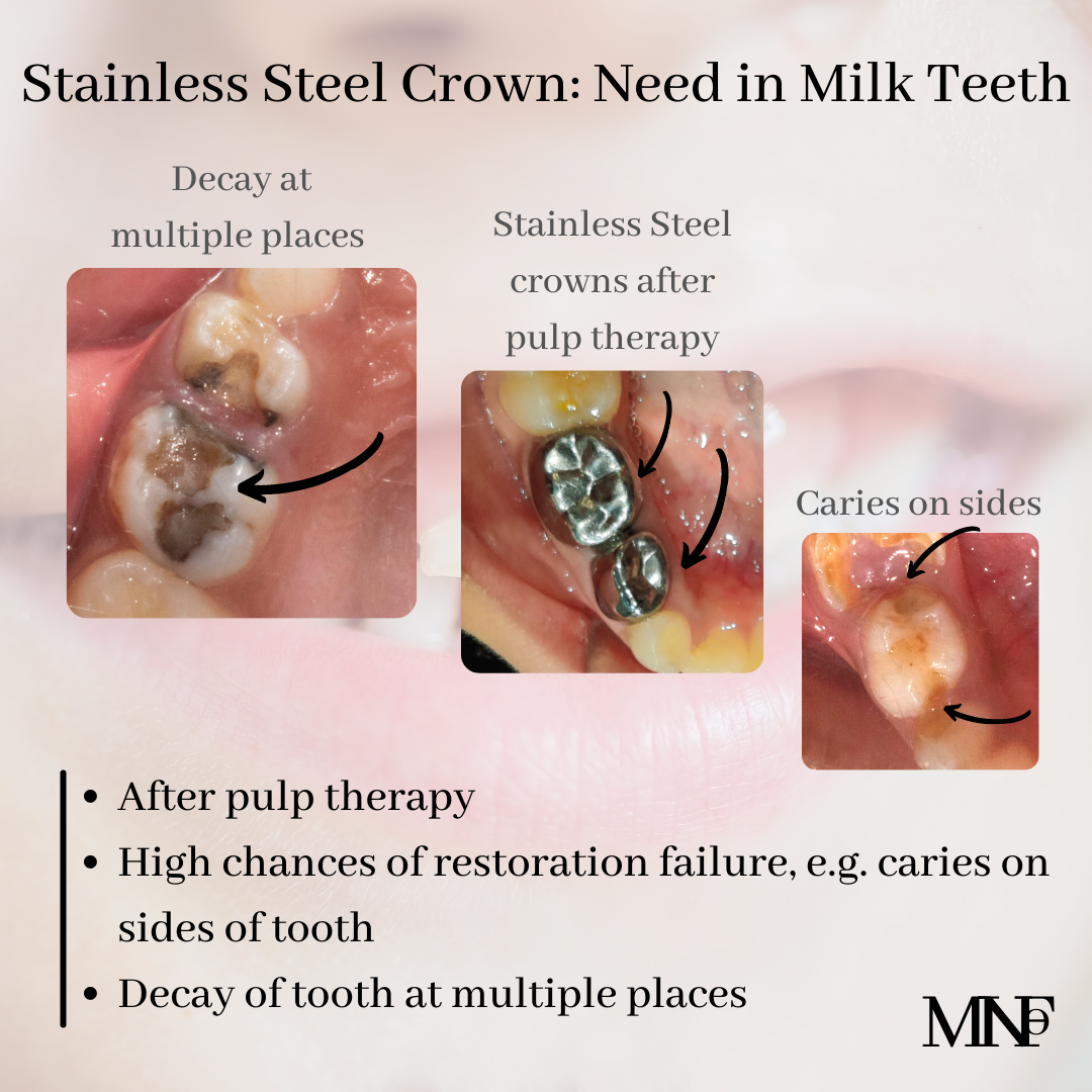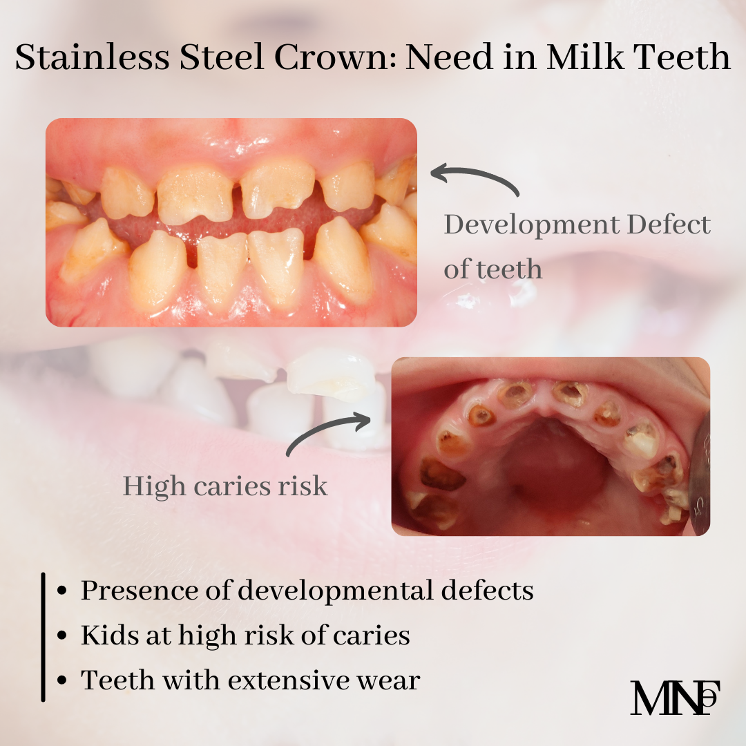 [ultimate_spacer height=”20″][ultimate_heading main_heading=”When kids need a Stainless Steel crown on milk teeth” heading_tag=”h3″ alignment=”left” margin_design_tab_text=””]Stainless steel crowns are used commonly for repairing and preserving severely damaged and decayed milk teeth. They have advantages of low cost, reliability, and durability. Stainless Steel Crowns are required in some situations –